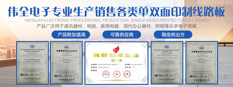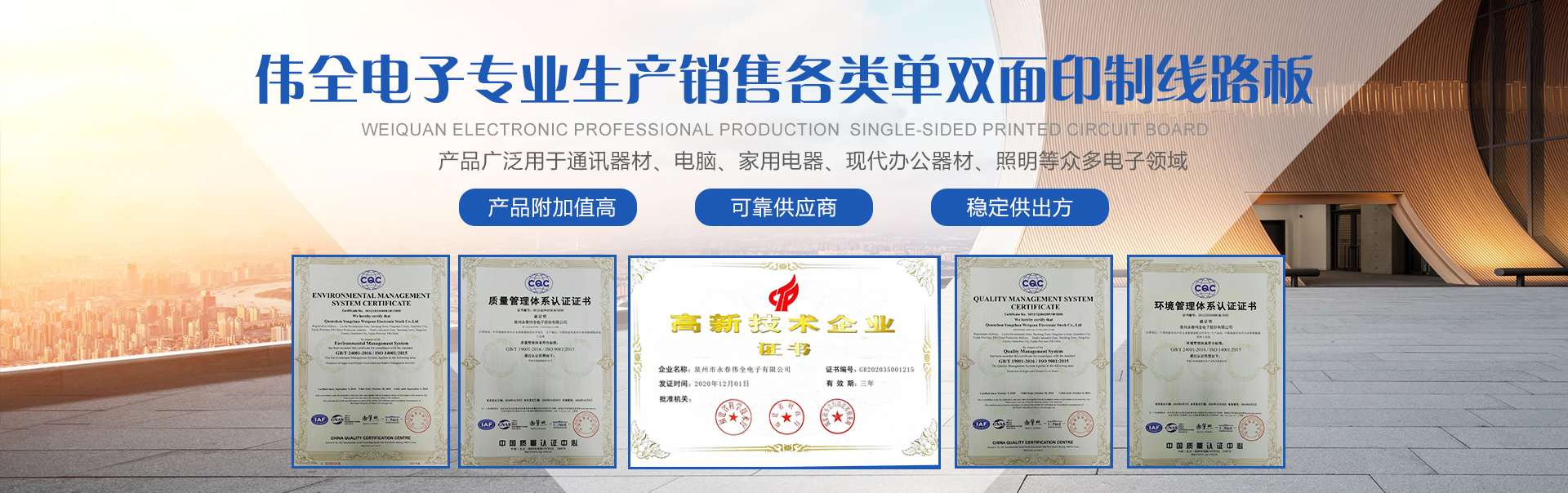 泉州永春偉全電子股份有限公司是一家合資企業(yè)。創(chuàng)辦于2011年,專業(yè)生產各類單面印制線路板,是福建省專業(yè)生產印制線路板的主要廠家,公司坐落在泉州市永春縣桃城鎮(zhèn)留安開發(fā)區(qū)添福工業(yè)園,占地面積達10多畝,交通方便。公司現有員工80多人,總投資3000多萬元人民幣,年生產能力逾20萬平方米。